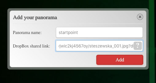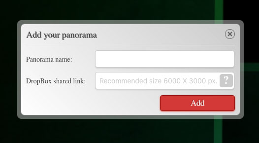 Give the name for your panorama, and insert the dropbox shared link (please upload your panoramas files into dropbox in any place, recommended 6000 x 3000 px but no limitations, you are free to use any size). To get the shared link, go to your dropbox account into the folder with your files. Mouse over the line with the needed panorama
